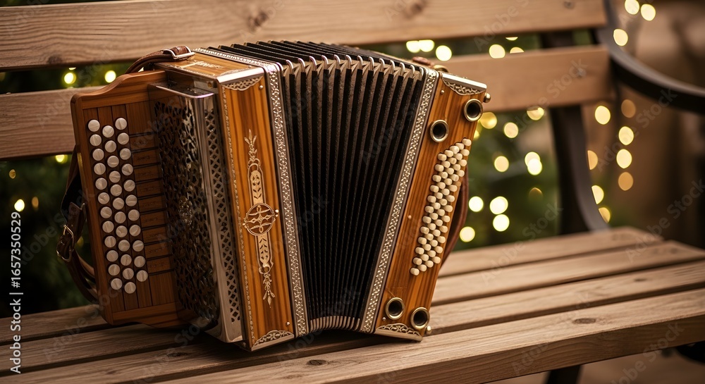 Close-up of a traditional wooden accordion with intricate details resting on an outdoor park bench against a magical bokeh light background. #1657350529