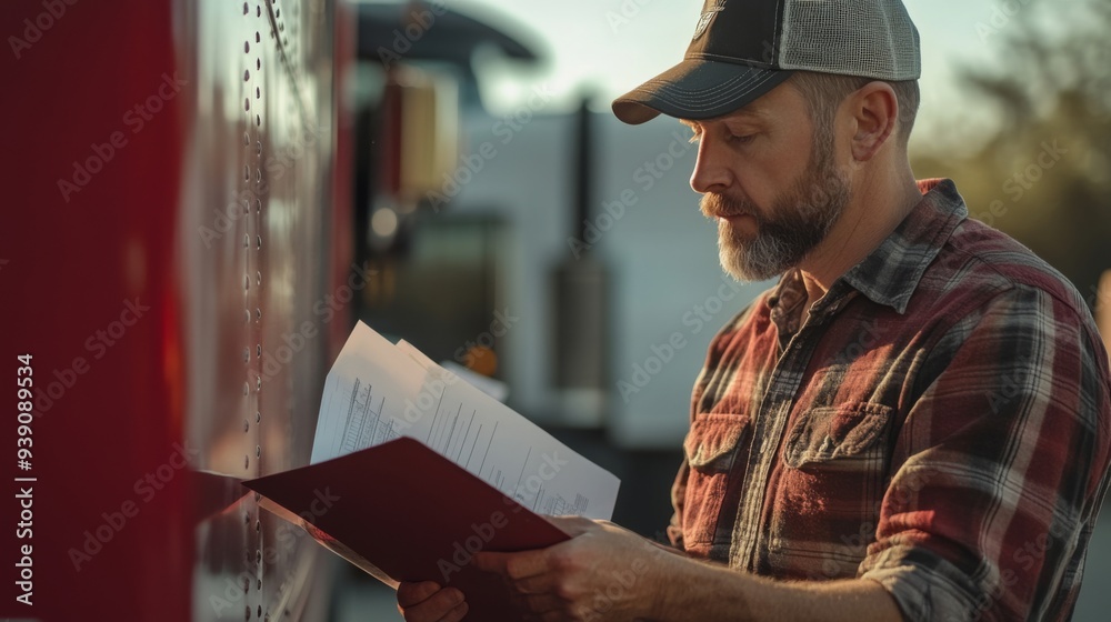 Close-up of a truck driver checking delivery paperwork at a loading dock, with emphasis on the truck and goods #939089534