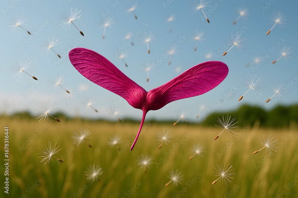 Close up of a vibrant pink maple seed flying with dandelion seeds in a meadow, symbolizing nature, freedom, growth, wind, and the spread of new life in the environment #1678316441