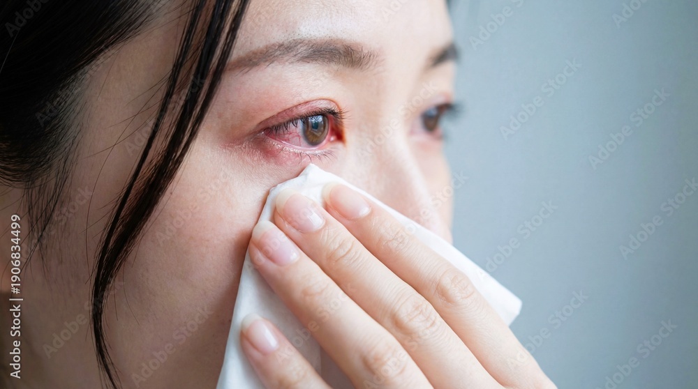 Close-up of a woman dabbing her red, irritated eye with a white tissue to alleviate discomfort and dryness symptoms #1906834499