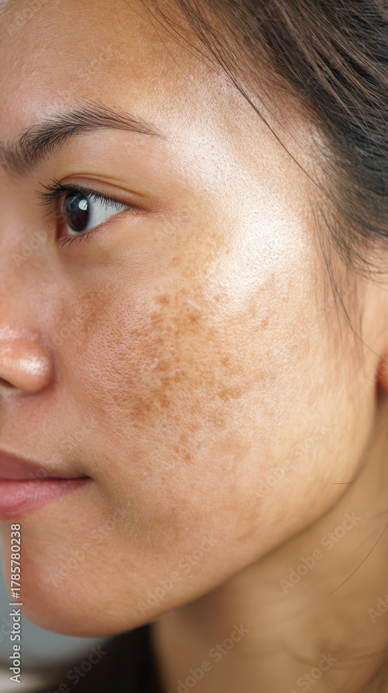 Close-up of a woman's face highlighting skin texture, freckles, and pigmentation with natural lighting and neutral background #1785780238