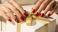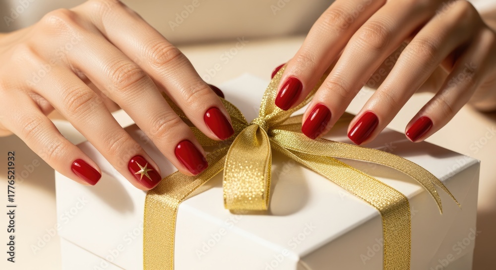 Close-up of a woman's hands with red nails tying a golden ribbon on a white gift box. The scene conveys a festive atmosphere, perfect for celebrations. #1776521932