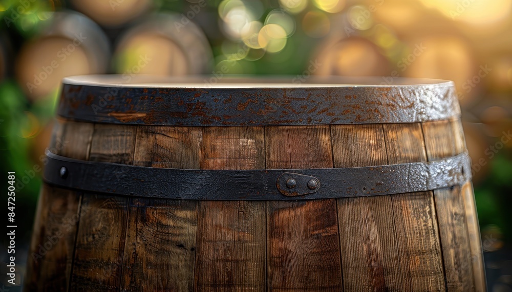 Close-up of a wooden barrel with blurred background, showcasing the texture and metal bands in natural light. #847250481