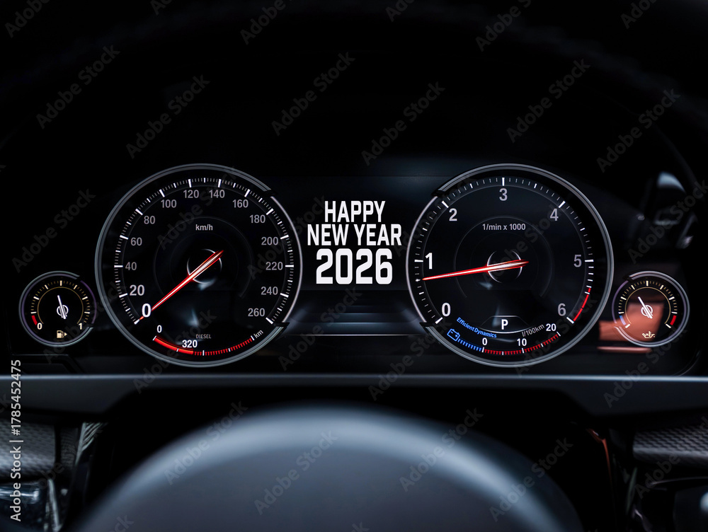 Close-up of an automobile instrument panel showing odometer, speedometer, tachometer, and fuel gauge, featuring a message that reads "Happy New Year 2026." #1785452475