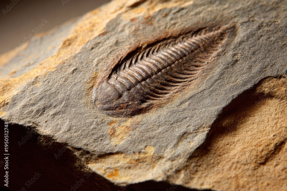 Close-up of ancient fossil imprint on rock slab showing segmentation and mineral tones #1950512748