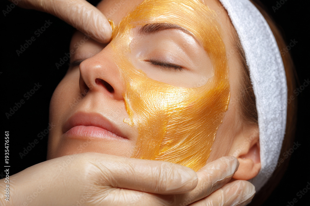 close-up of beautician'sgloved hands smoothing gold gel face mask across woman'scheek, ultra-detailed texture, soft clinical lighting #1935476561