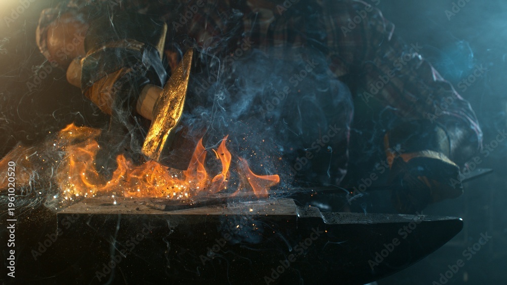 Close-up of blacksmith forging glowing hot iron on anvil with flying sparks #1961020520