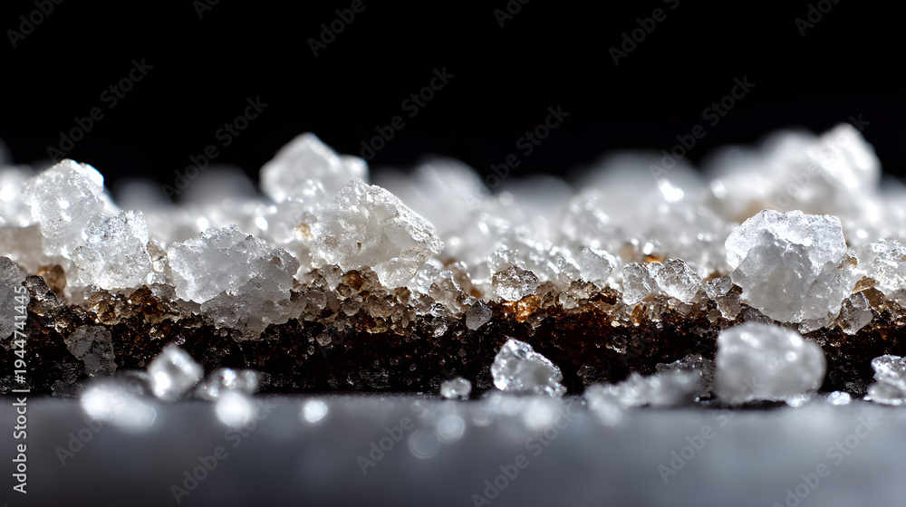 Close-up of brown food or wood surface covered with white sugar crystals on black background, texture and detail of crystalline structure #1944741445