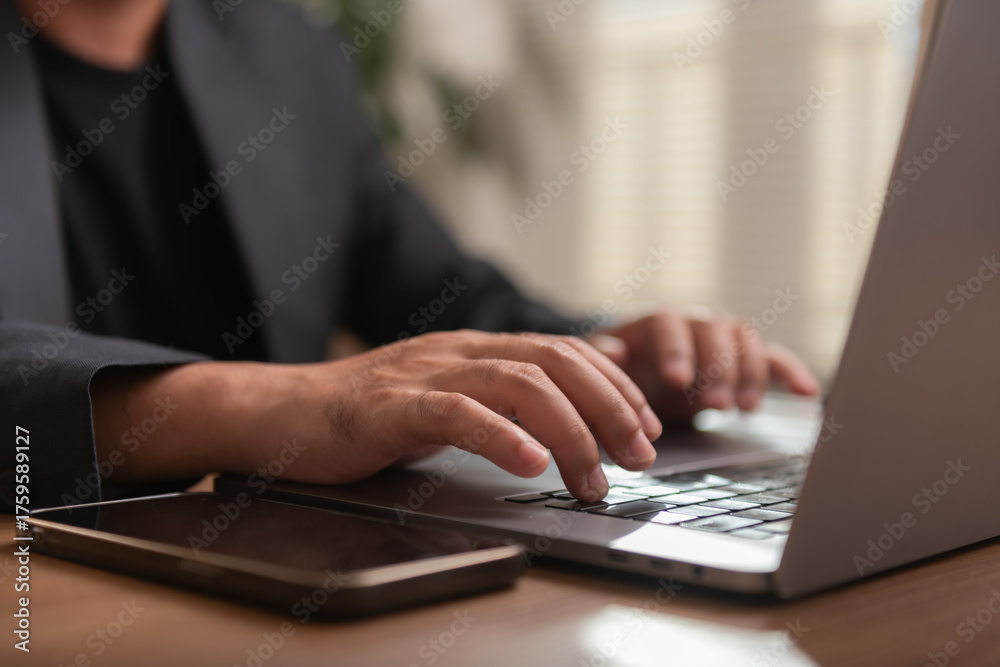 Close-up of businessman's hands typing on laptop keyboard at office desk with smartphone. Concept of remote work, digital communication, productivity, and modern workspace. #1759589127