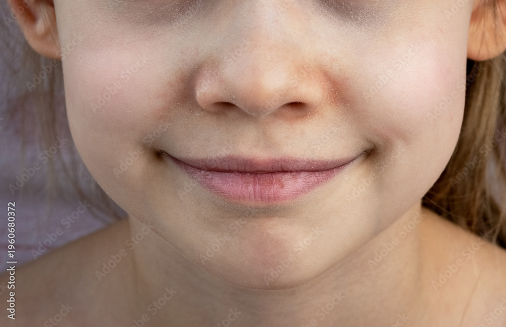 Close up of childs face with weathered skin and chapped lips. Sensitive skin to wind and cold weather. Atopic dermatitis. Baby skin care. Health care #1960680372