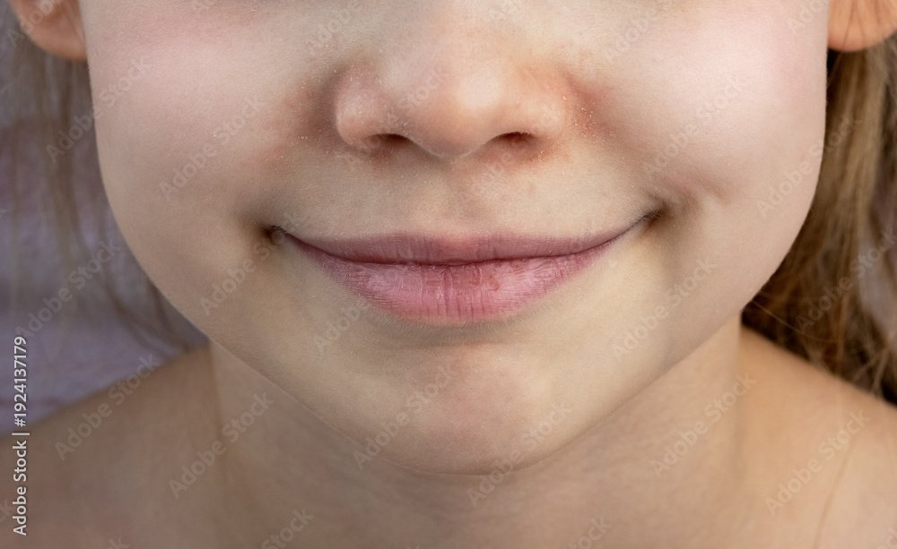 Close up of childs face with weathered skin and chapped lips. Sensitive skin to wind and cold weather. Atopic dermatitis. Baby skin care. Medicine. Healthcare #1924137179