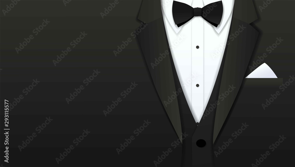 Close up of classic formal male tuxedo and bow tie with copy space, Paper art cut and craft style background #293115577