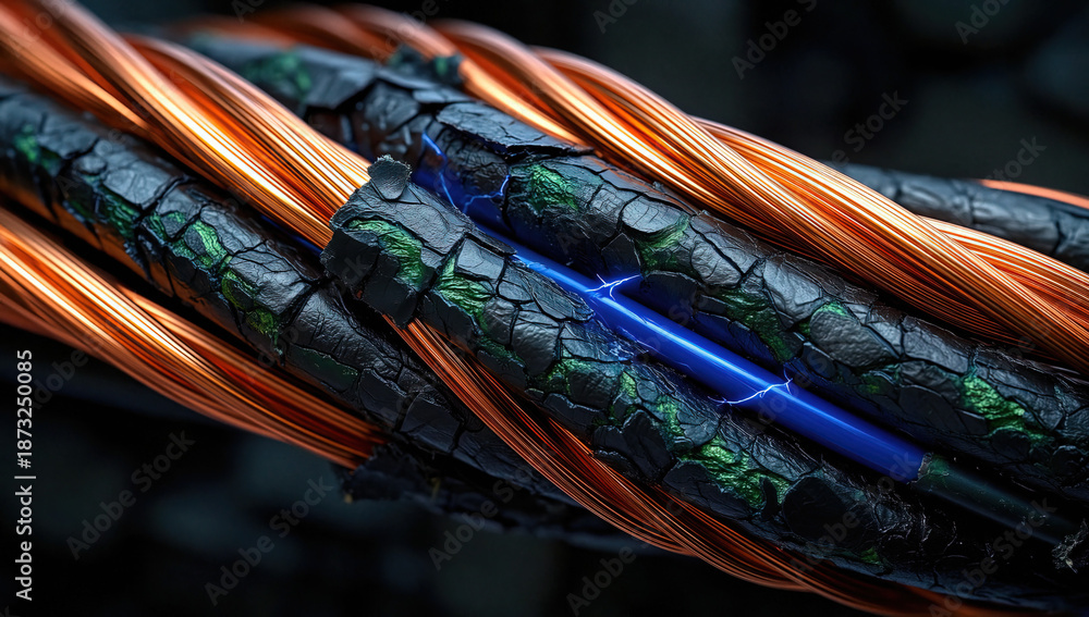 Close-up of copper wires with cracked insulation and glowing blue core #1873250085