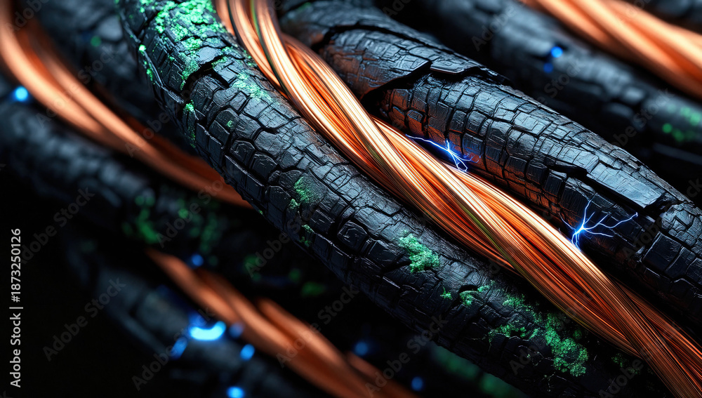 Close-up of damaged electrical wires with exposed copper and cracked insulation #1873250126