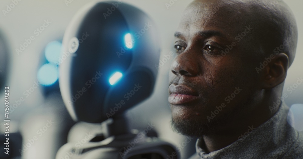 Close Up of Engineer Monitoring Humanoid Robots in Futuristic Factory. Focused Expression Shows Responsibility, Innovation, and Control in Era of Automation, Robotics, and Industry 4.0 Evolution. #1757019202
