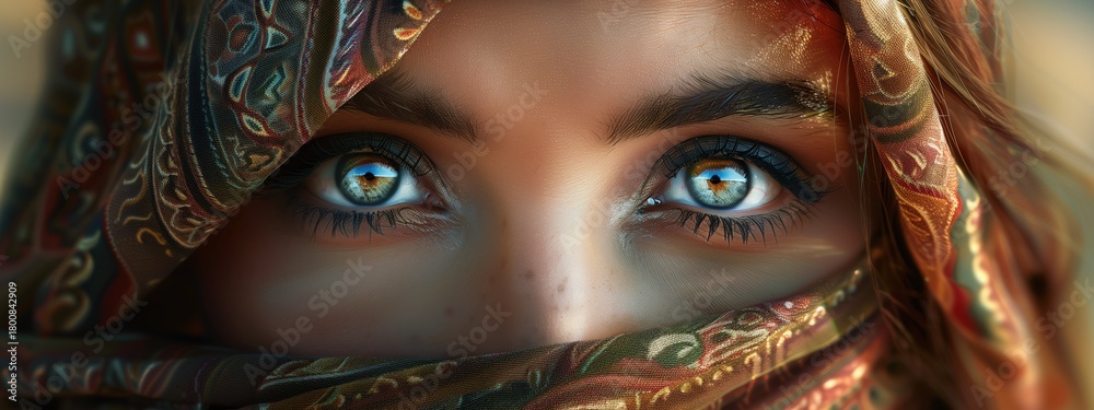 Close-Up of Enigmatic Eyes Framed by a Colorful Scarf in Natural Light Setting #1800842909