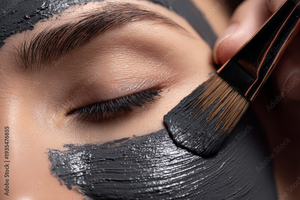 close-up of esthetician using brush to evenly spread charcoal mask across woman'scheekbone, detailed skin realism, soft diffused light #1935476855