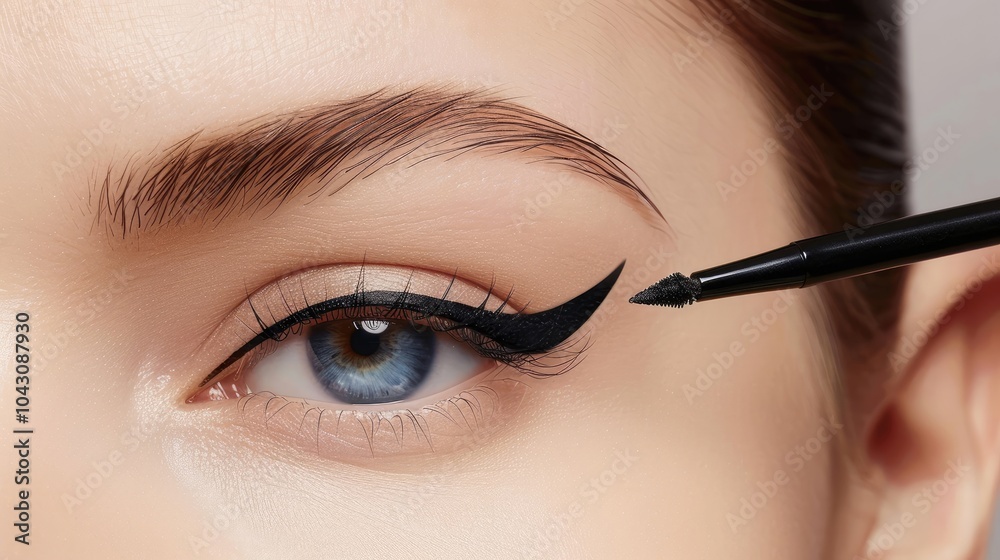 Close-up of eyeliner application on a model's eye, focusing on precision. Beauty, makeup, cosmetics, and eye makeup technique #1043087930