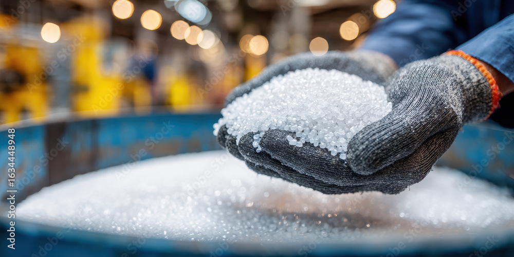 Close-up of factory worker hands in gloves holding a pile of white polypropylene granules (PP, PET chips semi dull #1634448948