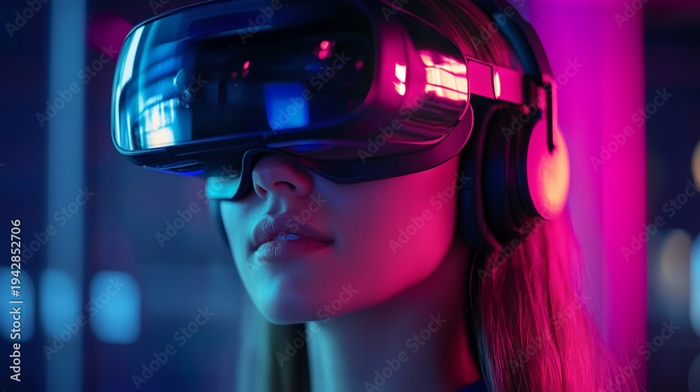Close-up of female VR developer testing virtual reality headset in innovation lab, immersive technology concept #1942852706