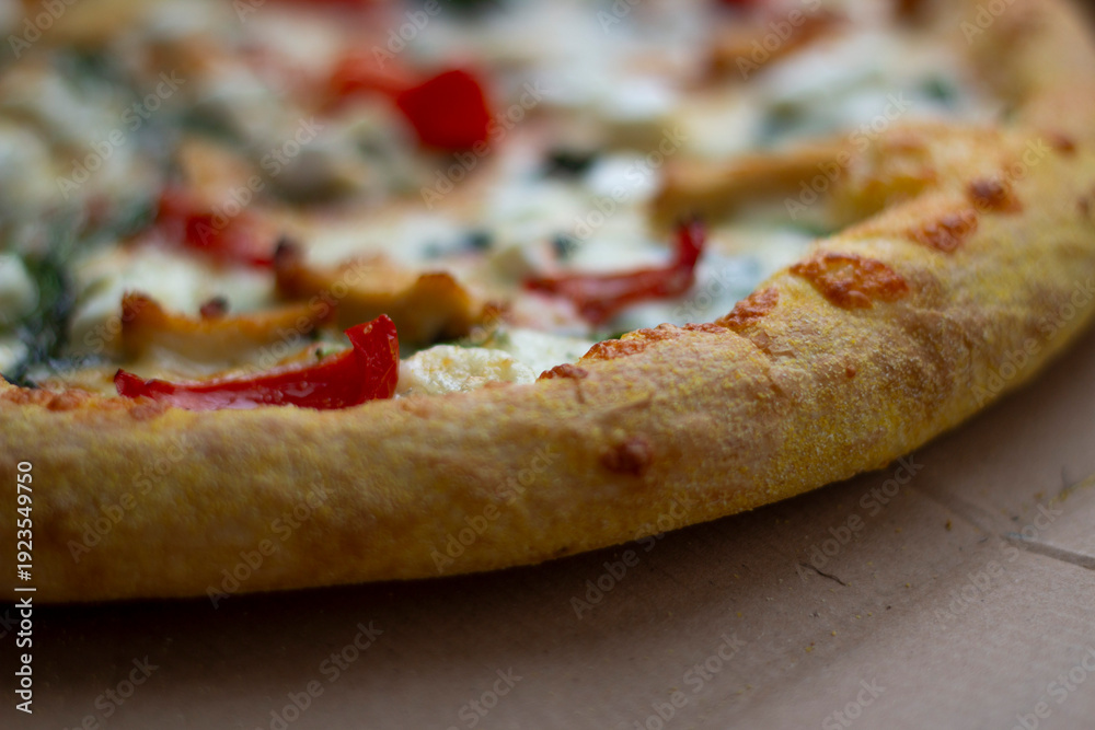Close-up of fresh pizza with melted cheese, red pepper and herbs in cardboard delivery box. #1923549750