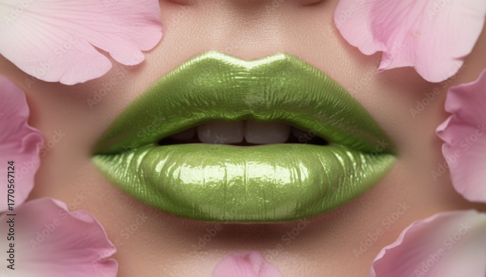 Close-up of glossy green lips surrounded by pink flower petals. The scene emphasizes beauty and cosmetic themes, highlighting vibrant colors and textures. #1770567124