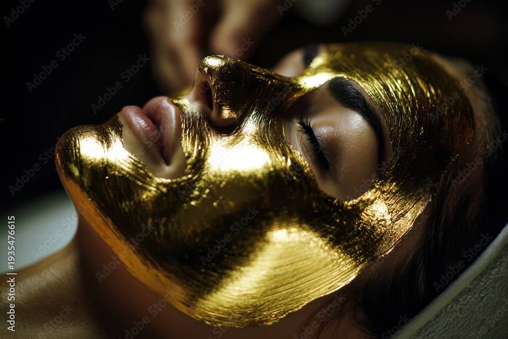 close-up of glowing female face covered in gold face mask during spa treatment, beautician blurred in background, ultra-sharp focus #1935476615