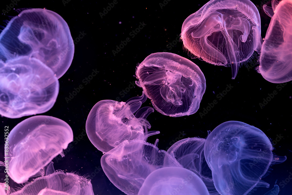 close up of glowing moon jellyfish floating on a black background. #835637552