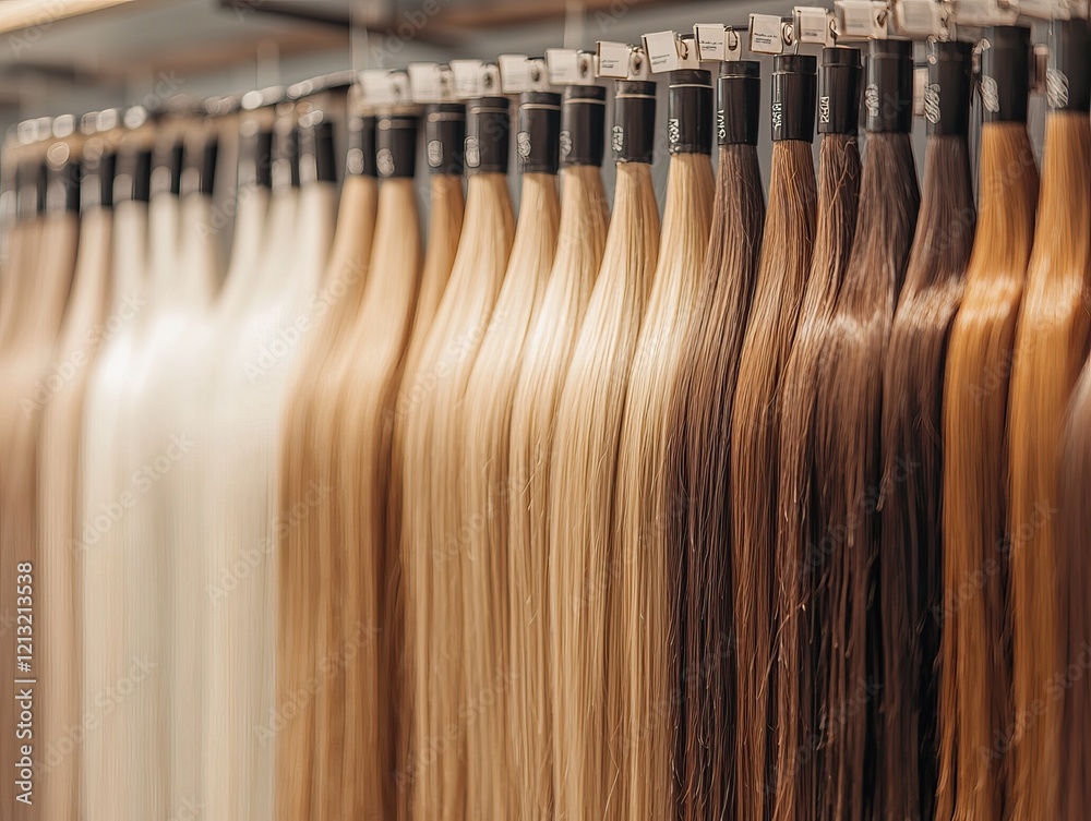 Close-Up of Hair Extensions in Various Shades on Display at a Hair Salon #1213213538