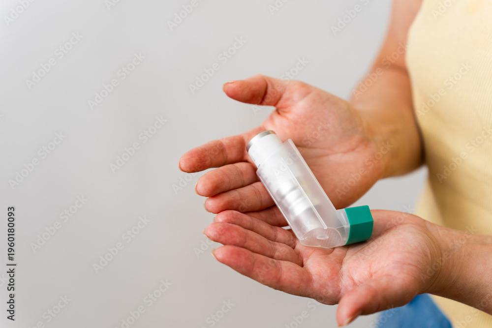 Close up of hand gripping asthma inhaler on white background. #1960180093