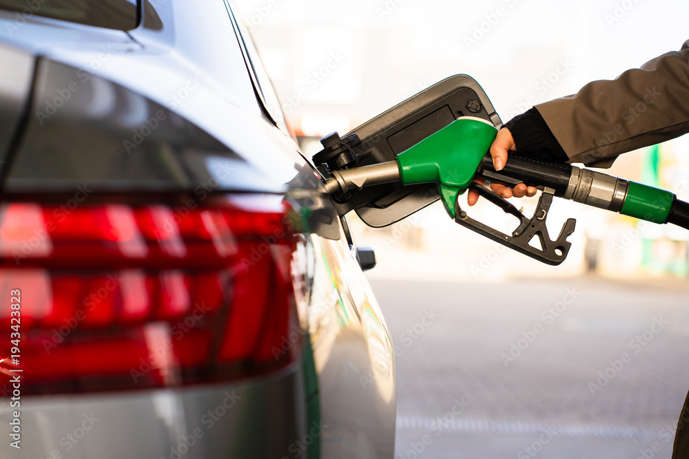 Close-up of hand refilling vehicle with gasoline. Fuel pump inserted into tank during refueling #1943423823