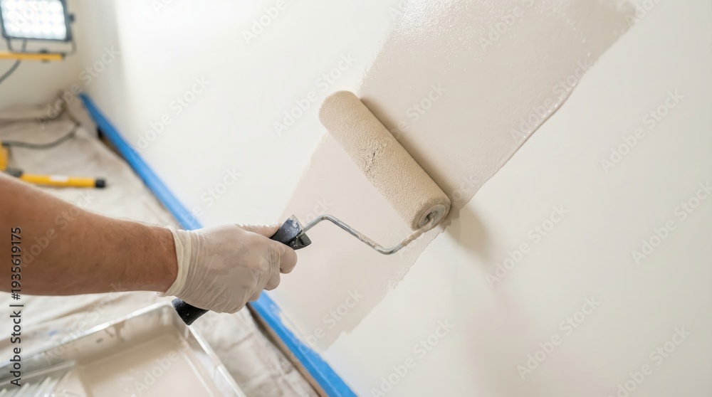 Close-up of hand rolling beige paint on wall with roller for home renovation and interior decoration #1935619175