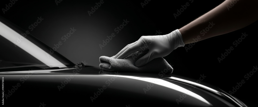 Close-up of hand wearing glove polishing shiny black car surface with microfiber cloth in dark studio environment #1909378836