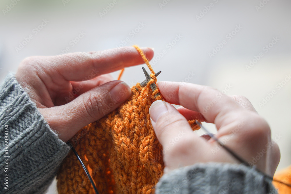 Close-up of hands knitting. Hands of a young woman knitting. #1922134174