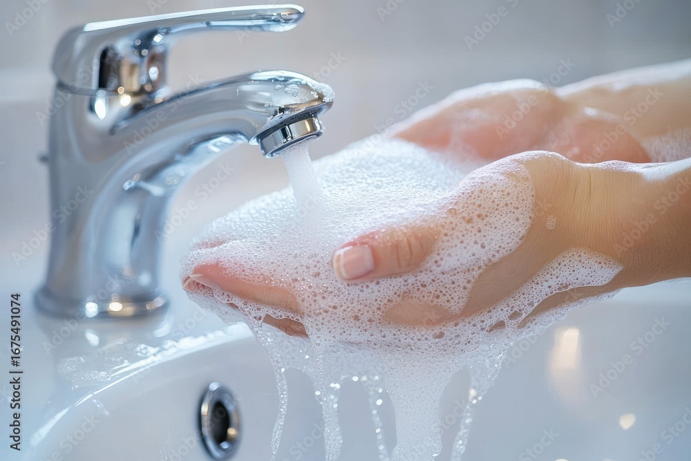 Close-up of hands lathered with soap under running water from a chrome faucet in a clean white sink, symbolizing hygiene and cleanliness #1675491074