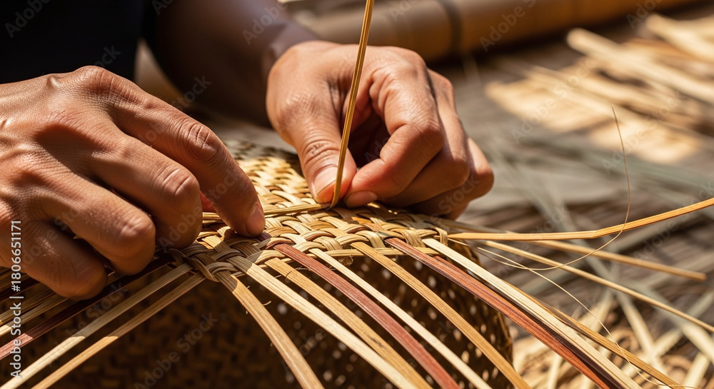 Close up of hands weaving natural fibers into a basket #1806651171