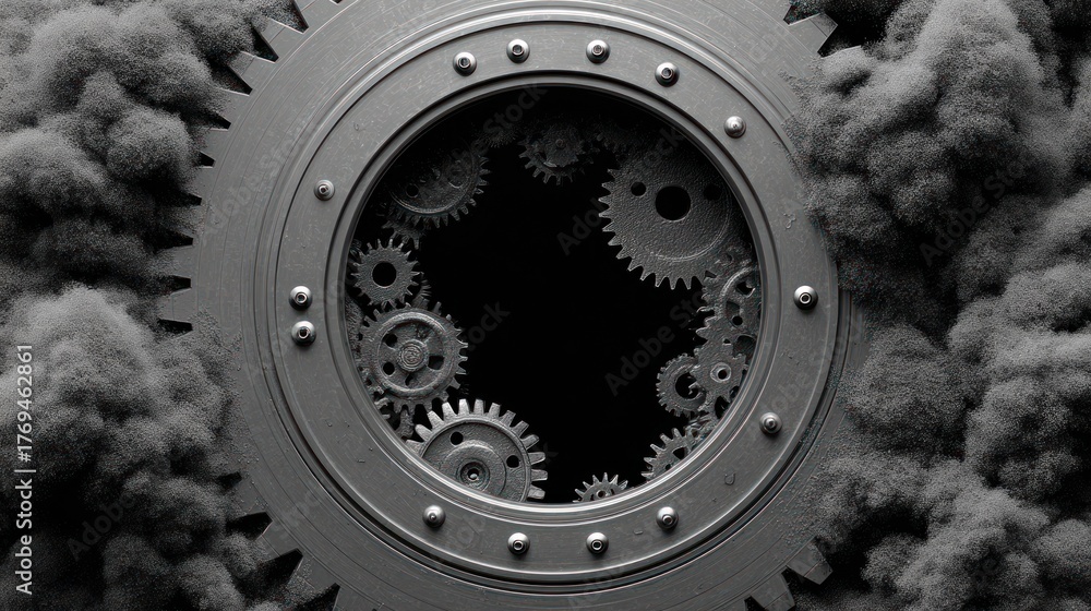 Close up of industrial gears and cogs with smoke clouds suggesting pollution #1769462861