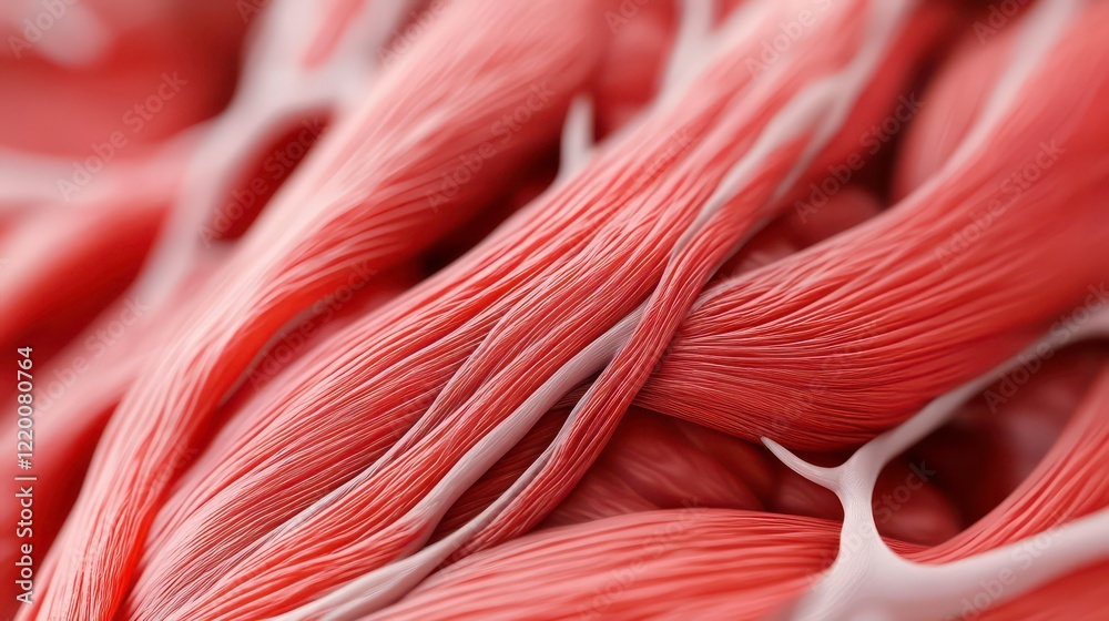 Close-up of intricate red muscle fibers, showing texture and structure. #1220080764