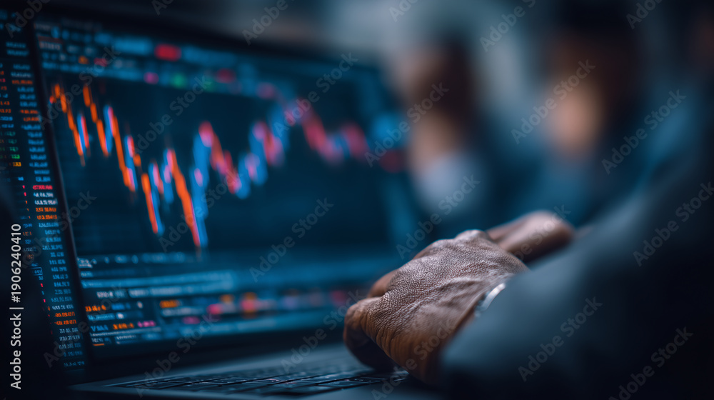 Close-up of investor analyzing stock market data on laptop with candlestick chart and financial statistics on screen in trading environment #1906240410