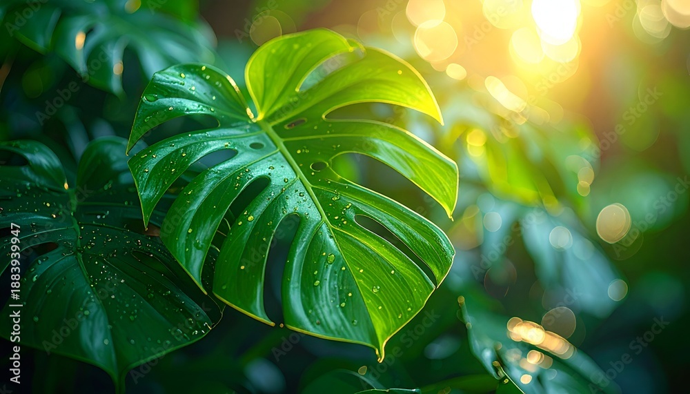 Close-up of large, glossy green leaf with bright sunlight background #1883939947