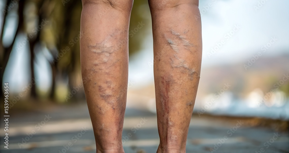 Close-up of legs with visible varicose veins outdoors. Medical and health concept showing chronic venous disease, circulation issues, or vascular condition. Real, unretouched appearance. #1539163654