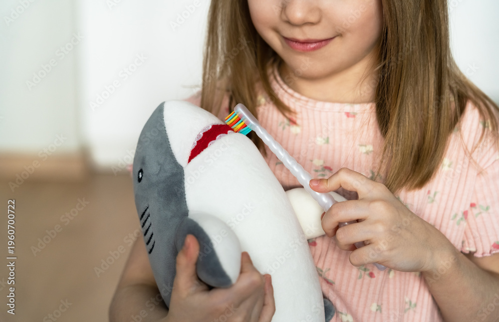 Close up of little girl brushes teeth of toy shark. Childrens hands with toothbrush. Baby milk teeth change. Oral hygiene. Health care #1960700722