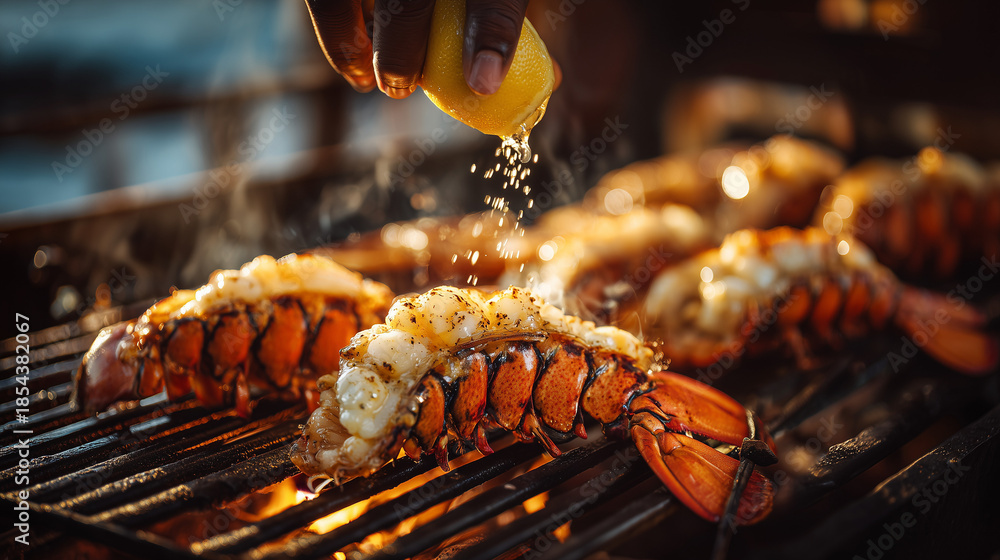Close up of lobster tails grilling over open flame as fresh lemon juice drips on top, sizzling seafood with charred texture, gourmet barbecue moment. #1854382067