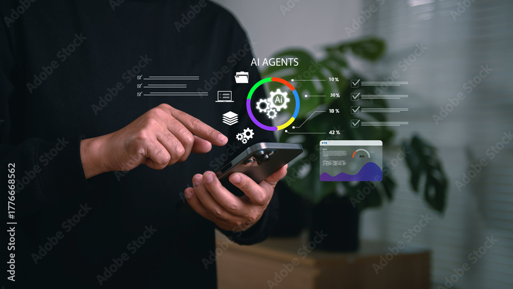Close-up of man using smartphone with virtual AI agents interface, data visualization, and automation icons, representing artificial intelligence integration in smart mobile technology. #1776668562