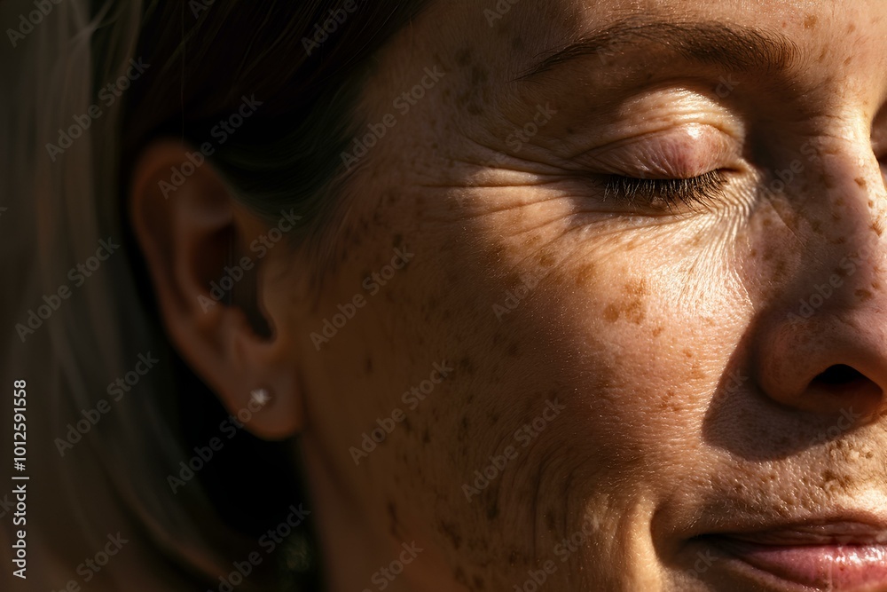 色素沈着のある成熟した女性の肌のクローズアップ、コピースペース|Close up of mature woman skin with hyperpigmentation. Copy space. #1012591558