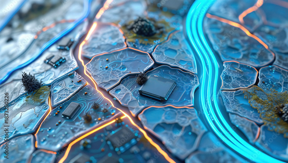 Close-up of Microchip Circuit Board with Glowing Blue and Orange Lines, Electronic Components #1873250226