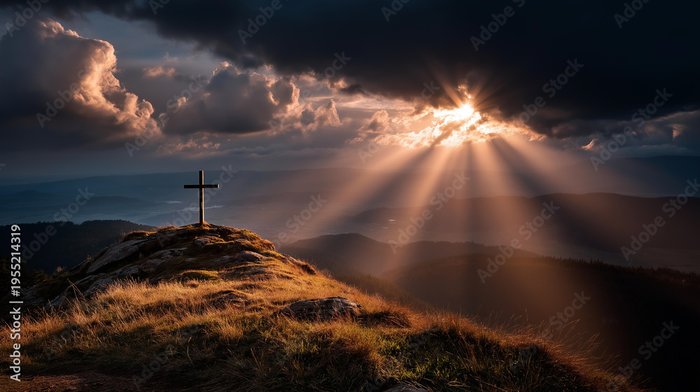 Close up of morning sunlight breaking through scattered clouds above a hilltop cross the light rays forming dramatic crepuscular beams radiating from behind the cross creating #1955214319