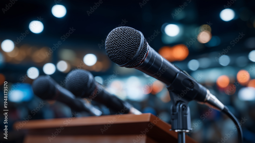 Close-up of multiple microphone plugs connected to a press podium, shallow focus isolating connectors, soft bokeh in the background, subtle metallic reflections and cable textures #1948173570