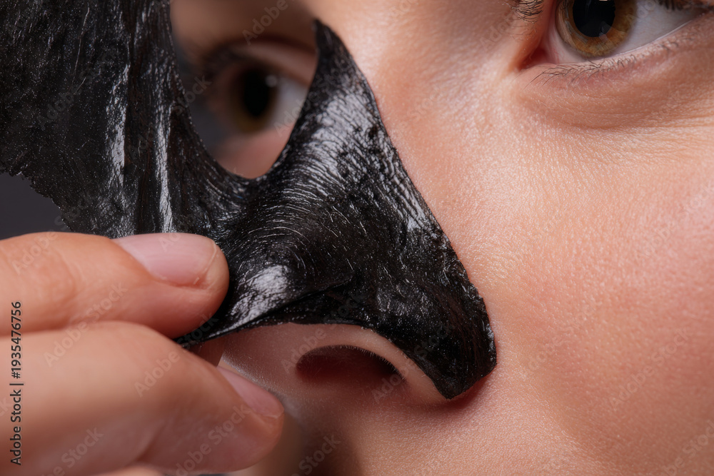 close-up of peel-off blackhead mask being lifted from woman'snose, detailed texture realism, shallow depth of field, soft clinical light #1935476756