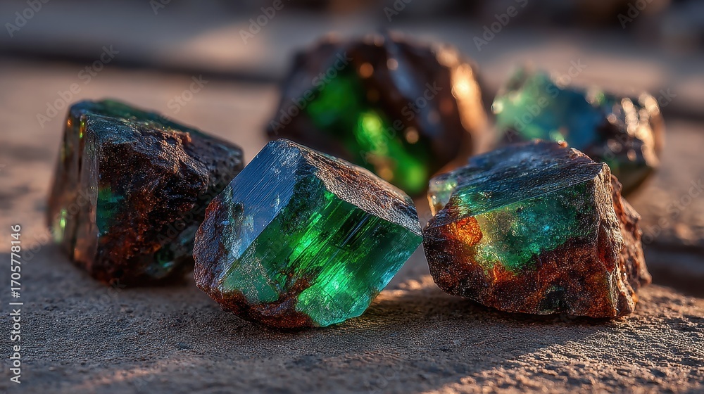 Close up of raw uranium ore with deep green and black textures industrial mining setting hard sunlight casting shadows mineral exploration photography #1705778146